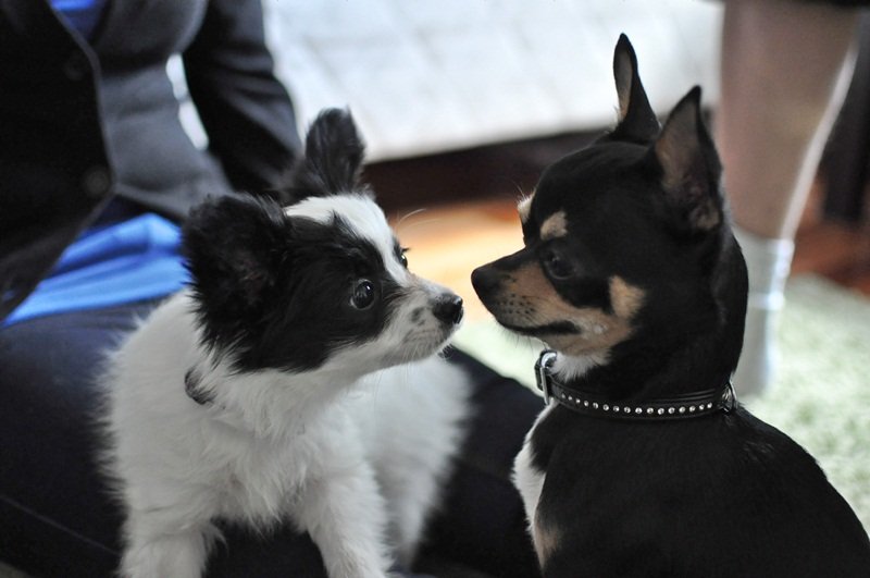 Romeo saikin taas uuden koirakaverin, kun Phalènen pentu Milo kävi kylässä. Voi mahdoton miten suloinen pieni karvapallo se olikaan! Romppu oli myös erittäin kiinnostunut pikkuisesta, ja ensiksi Milo lähinnä kipitti Romppua karkuun ihmisten taakse ja syleihin turvaan. Romeo myös sai mustasukkaisuus kohtauksia, kun Milo hyppäsi syliini rapsutettavaksi.